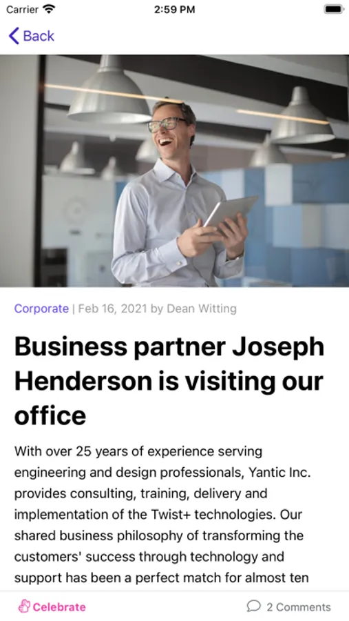 - Articles: Share the latest company news and announcements with your employees. Enable push notifications to make sure everybody is up to date immediately.