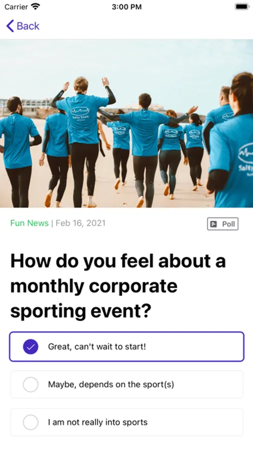 - Polls: Create polls for your employees. Want to know which brand-new design is the most popular one? Or do you just want to let people choose what's for lunch this week? Create a poll, target your audience and receive feedback immediately.