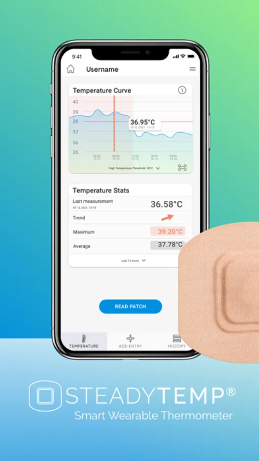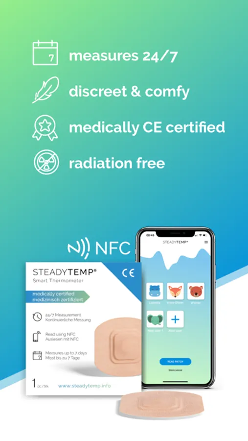 When a family member is sick the first thing you do is check their temperature. That is because an elevated temperature is one of the first bodily signals that you might be fighting an infection. The STEADYTEMP® smart wearable thermometer is a continuous temperature system made up of two parts. A temperature sensor which is embedded in an adhesive patch and the free mobile app which is used to read the patch and graphically display temperature levels and curves and much more. Once activated the patch tracks body temperature continuously for up to 7 days – even while you sleep.