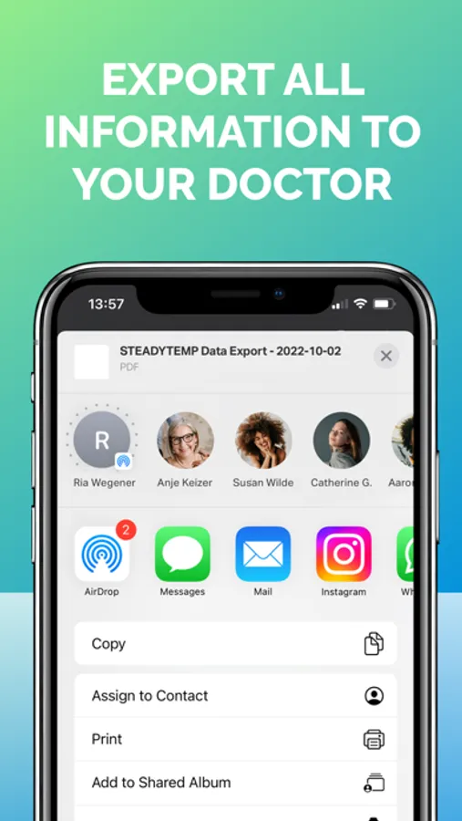 The STEADYTEMP® App is your own personal Health Journal. Temperature, symptoms and medications can be recorded and data exported to a medical professional.