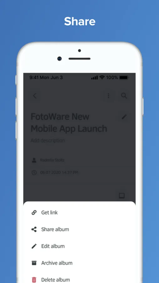 Find, preview and describe assets with metadata, run approval workflows from your mobile, and upload new assets from your photo library or the Files app. Share content with your teammates or external contacts in no time.