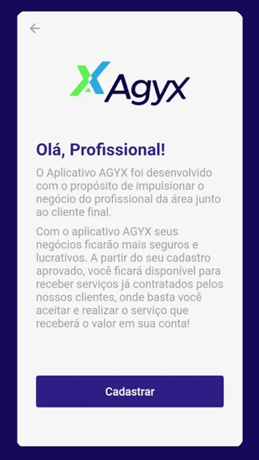 Com o aplicativo AGYX seus negócios ficarão mais seguros e lucrativos. A partir do seu cadastro aprovado, você ficará disponível para receber serviços já contratados pelos nossos clientes, onde basta você aceitar e realizar o serviço que receberá o valor em sua conta!