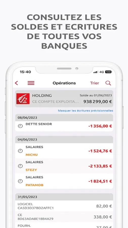 - Consultez les soldes et écritures de l’ensemble de vos comptes dans toutes vos banques gérées dans votre solution « Suite Entreprise »