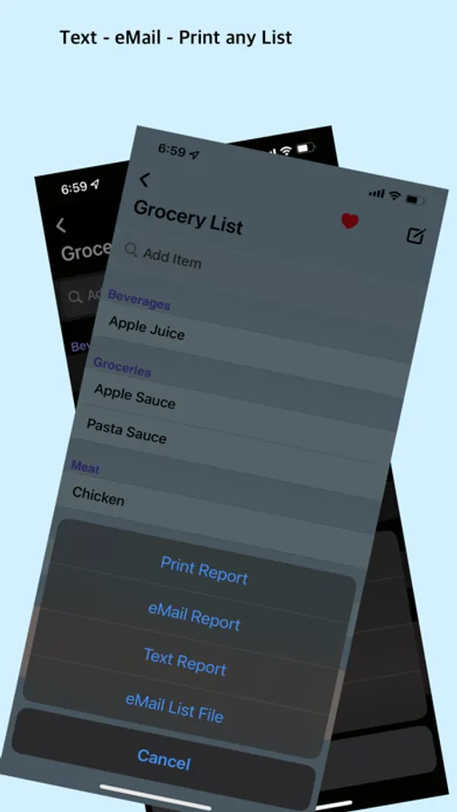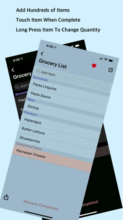 Items are quickly added from the drop-down listing or typed or dictated. With just a touch items are easily marked completed and moved to a completed section. Tap an item again to undo.