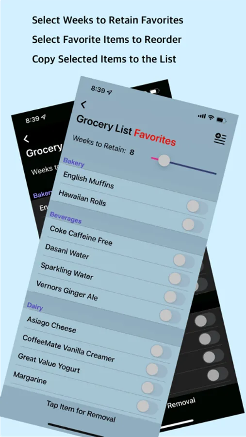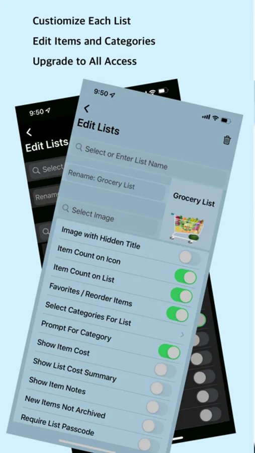 Lists with a selective drop-down listing of items, sorted by categories, with optional favorites, reordering, item quantities, notes, cost tracking. You can pick the features of each list.