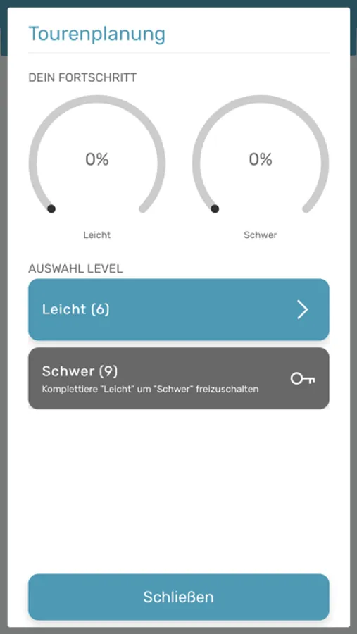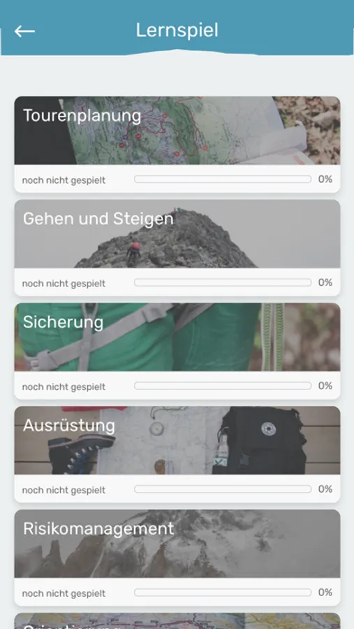Ein Lernquiz mit Fragen aus den Kategorien Tourenplanung, Gehen und Steigen, Sicherung, Ausrüstung, Risikomanagement und Orientierung macht Dich in zwei Levels vertraut mit relevanten Themen, die Dich auch in schwierigen Situationen helfen können. Zudem lernst Du, wie Du Touren richtig planst und wie Du Werkzeuge wie Kompass und Planzeiger einsetzen kannst.