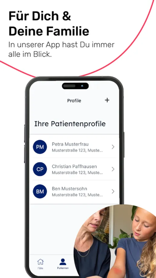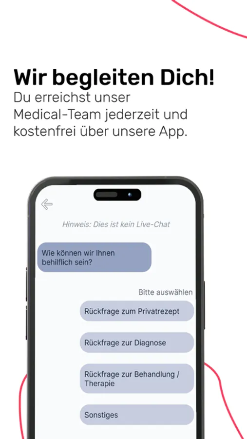 - Bei Rückfragen zu Deiner Behandlung oder Folgerezepten nimm einfach über die App Kontakt mit uns auf! Wir beantworten alle Deine Fragen.