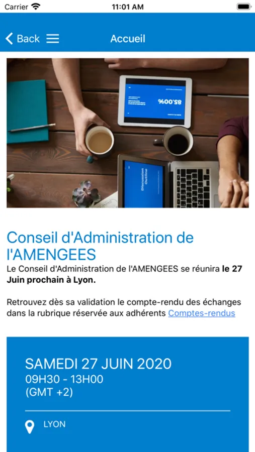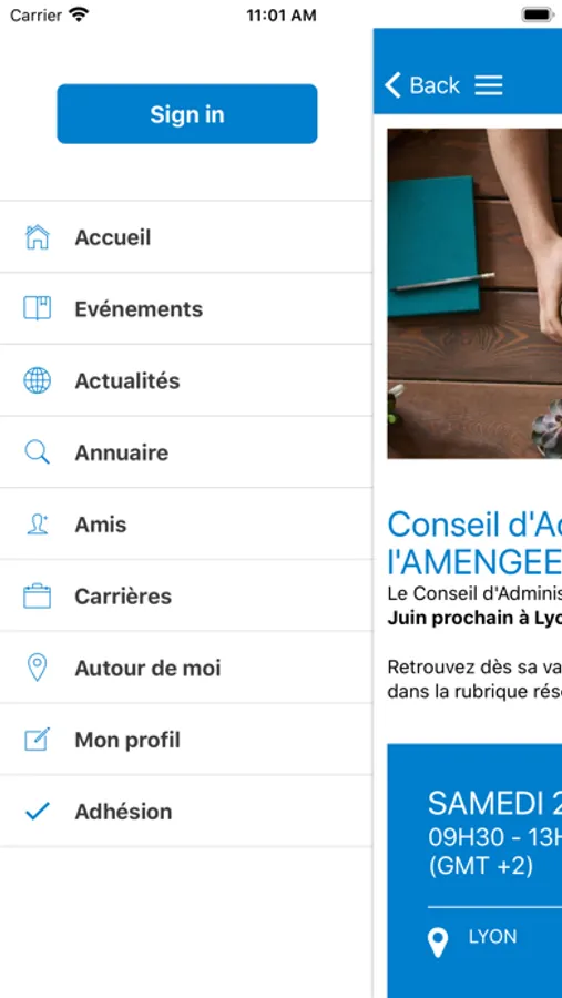 Elle vous permet d'accéder facilement aux principaux services présents sur notre site web : consultation de l'annuaire des alumni et géolocalisation des membres, mise à jour de votre profil, accès à l'agenda des événements et aux offres d'emploi.