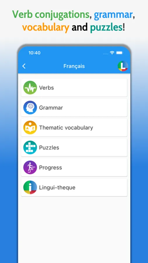 • Lessons and exercises: vocabulary, verb conjugations and grammar