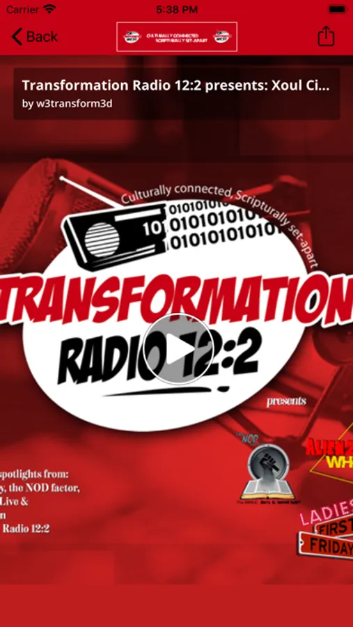Description: Always viewed as my "Dream Job", Transformation Radio 12:2 was birthed out of frustrations from listening to commercial radio and hearing the predictability of mainstream radio station programming. Transformation Radio 12:2 was founded on Romans 12:2, "Do not conform to the pattern of this world, but be transformed by the renewing of your mind. Then you will be able to test and approve what God's will is-his good, pleasing and perfect will."