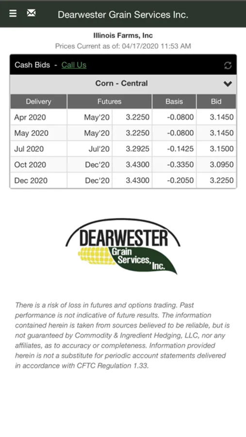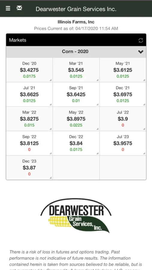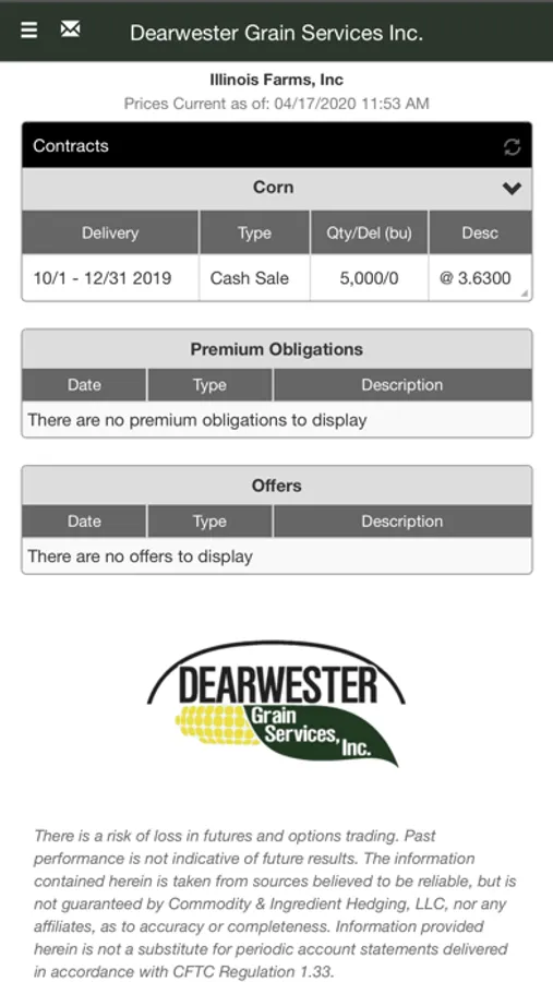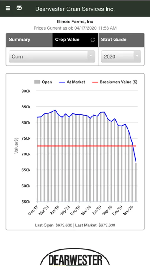 Dearwester Grain App delivers account information as well as historical data at your fingertips. The app focuses on guiding you to make better marketing decisions based on your operations acreage, yield, and expenses by calculating your break-even price, then comparing to the at market value on unsold bushels profitability.