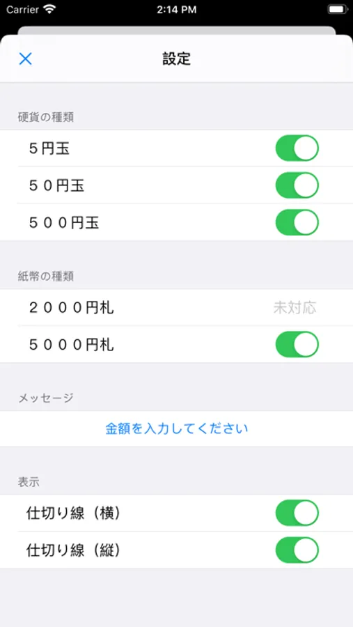 5円玉、50円玉、500円玉は使用有無を設定できます。