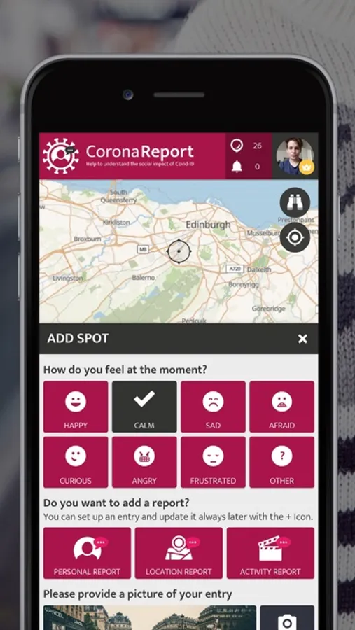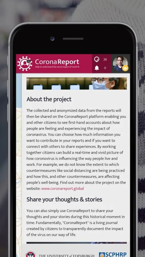 CoronaReport is a citizen science project developed by the Scottish Collaboration for Public Health Research and Policy (SCPHRP), and the University of Edinburgh. Citizens can record their experiences of the disease, and the effects on their lives. Please note: you can only contribute social science-related information in this app - it is not a medical tool nor does it offer any medical advice.