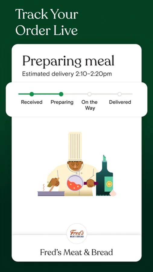Follow your delivery or takeout order every step of the way in the app and with text alerts. From your first tap on the app, to the moment you’re served warmly at your door.