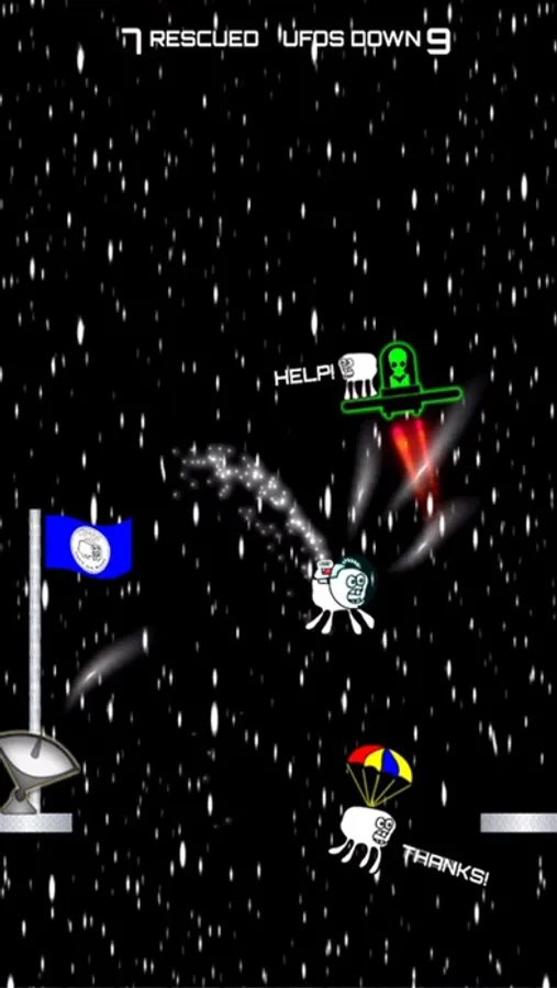 Then just when you think everything is okay, Alien UFOs abduct your crew and you have to rescue them from a fate worse than death! This is how to rescue a friend from an alien abduction: First, shoot a UFO to liberate your crew member. Then in turn jump up and tag the falling crew member to give them a parachute to save their life. They will thank you when you rescue them. You deserve a medal for the bravery you have shown.
