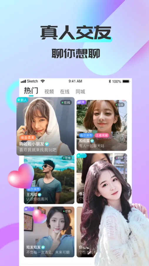 在可聊,你可以通过文字、语音、视频等多种方式与异性聊天互动,帮你找到身边的有缘人,遇到对的她。