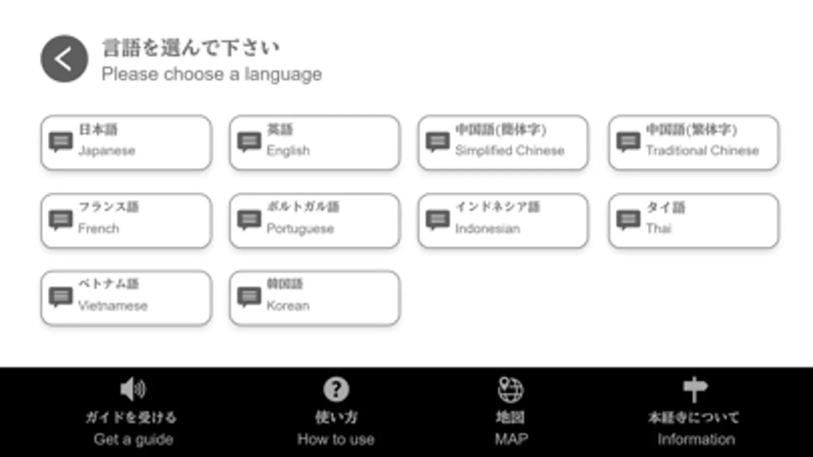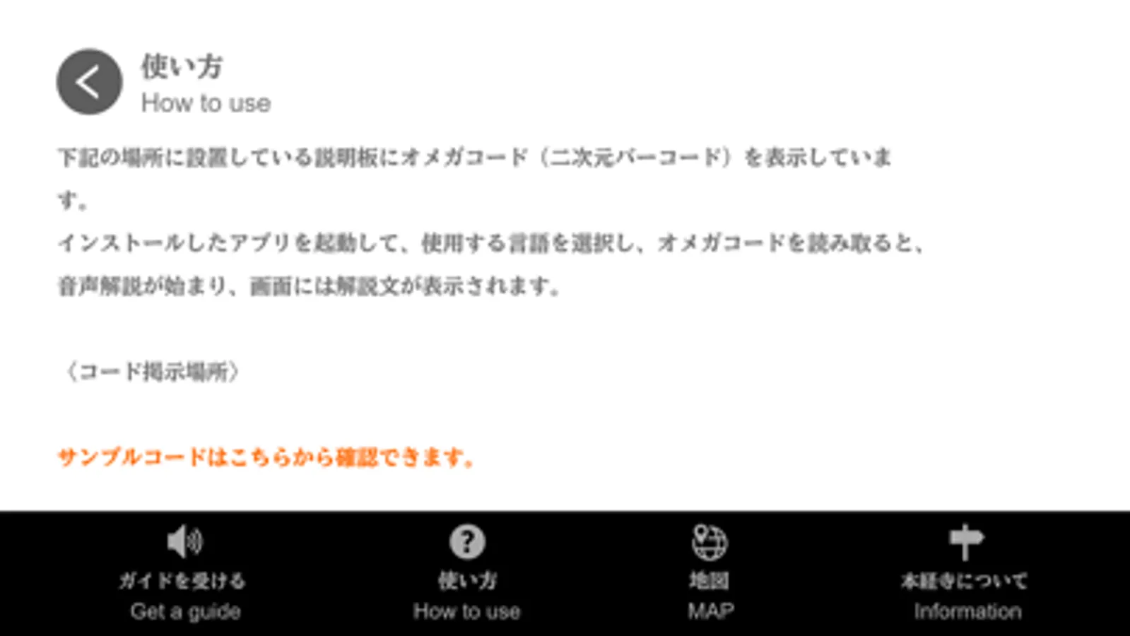 「 大村市 本経寺 多言語ガイド」はオメガコードを使用し、専用のコードを読み取っていただくと音声と画像付きテロップによりガイドします。