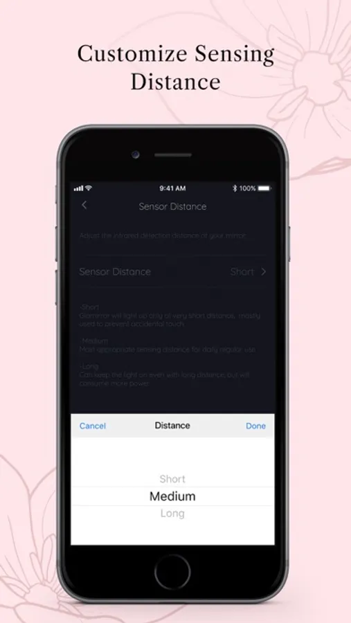 There are three sensor distances in the app, Short, Medium, and Long. You can set different sensing distances for different situations to light up the mirror.