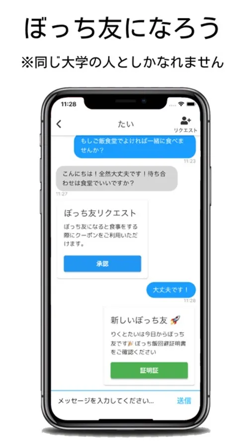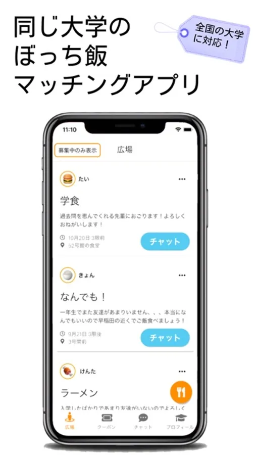 同じ大学のぼっち同士でマッチングして一緒にご飯が食べれる学生限定SNSです。