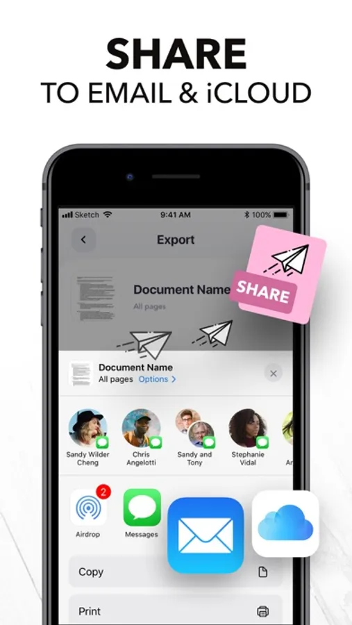 Export your scans as .PDF .DOCX or .TXT and share with iMessage, Adobe PDF, Email - Gmail - Outlook - Spark, Wi-Fi Printer, Box, Whatsapp, iCloud Drive, Facebook Messenger, Dropbox, Evernote, Google Drive, OneDrive, OneNote and any other app/platform!