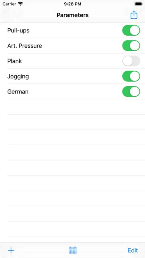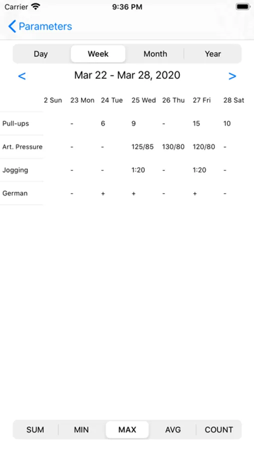 Keep your parameters: weight, blood pressure, the duration of sleep, training, foreign language lessons, etc., the number of tightenings, push-ups, etc., as well as any others. View your data in a convenient tabular and graphical form. Analyze. Develop yourself. Become better - stronger, faster, smarter!