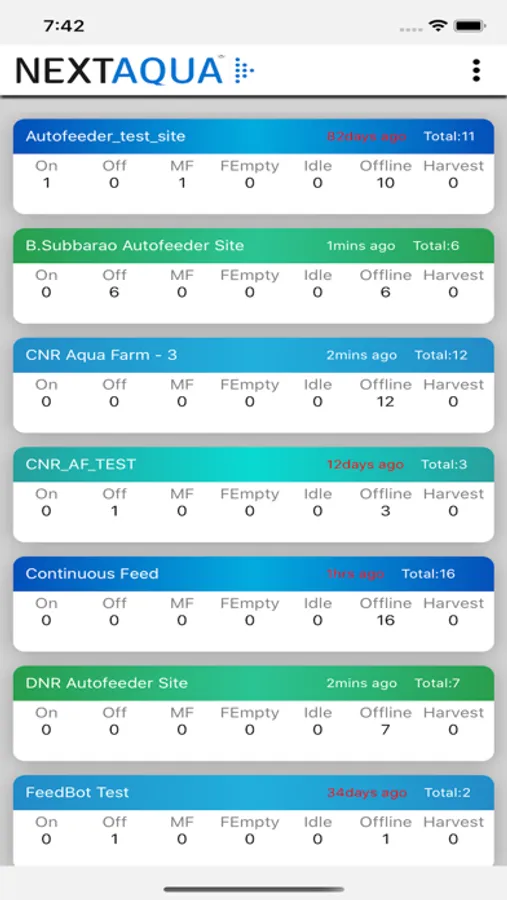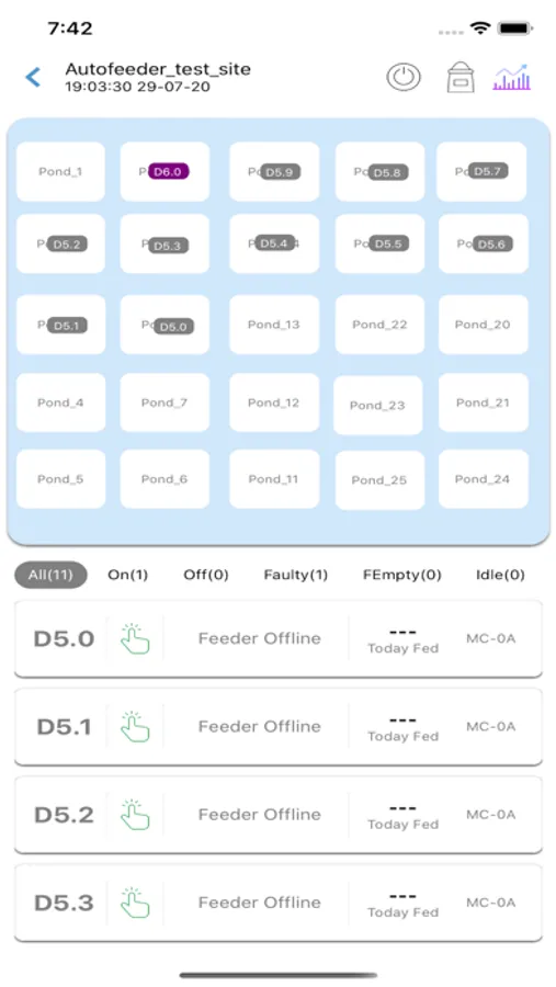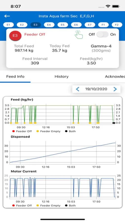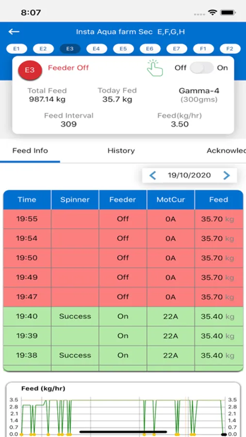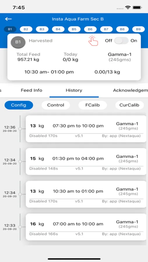 Existing Autofeeder controllers are simple timers with no logs or tracking. NextAqua’s patent pending** Autofeeder controllers are Mobile App Enabled making them Farmer friendly to check what’s the feeding pattern settings in live, throughout the day and even for the life cycle of the crop history for the entire farm. NextAqua’s mobile app shows clear marking on each pond with color indication, if the pond’s Autofeeder is On/Off/Unattended with Black/Grey/Red colours.