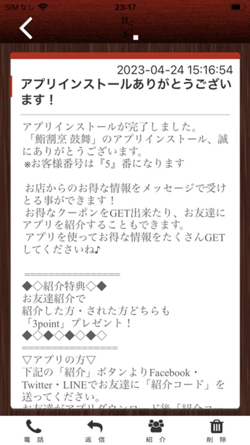 鮨割烹 鼓舞のアプリをSNSを通じてお友達に紹介する事ができます。