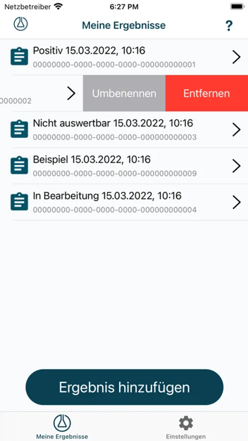 Die App erlaubt es, verschiedene Testergebnisse zu verwalten. Einmal gescannte QR-Codes werden in der App gespeichert und können so ohne Aufwand erneut abgefragt werden. Zur einfacheren Handhabung können die QR-Codes individuell benannt werden oder bereits bekannte Testergebnisse wieder aus der Liste entfernt werden.