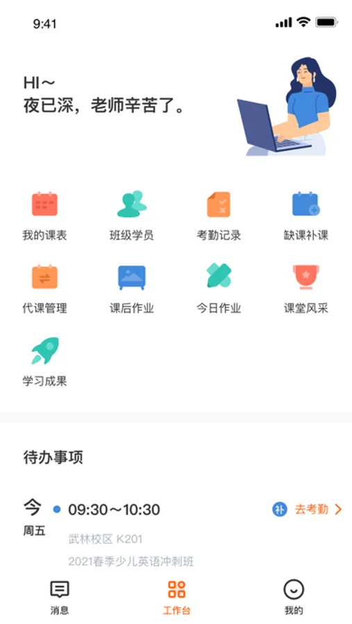 九抖机构版通过老师,教务,班主任,学术,学术主管,校长,总校长工作台驱动各角色工作。工作台包含异常预警,任务,岗位指标三块主要模块。在减少员工学习成本,提升工作效率的同时,员工可以非常清晰的看到和自身工作最重要的数据指标。