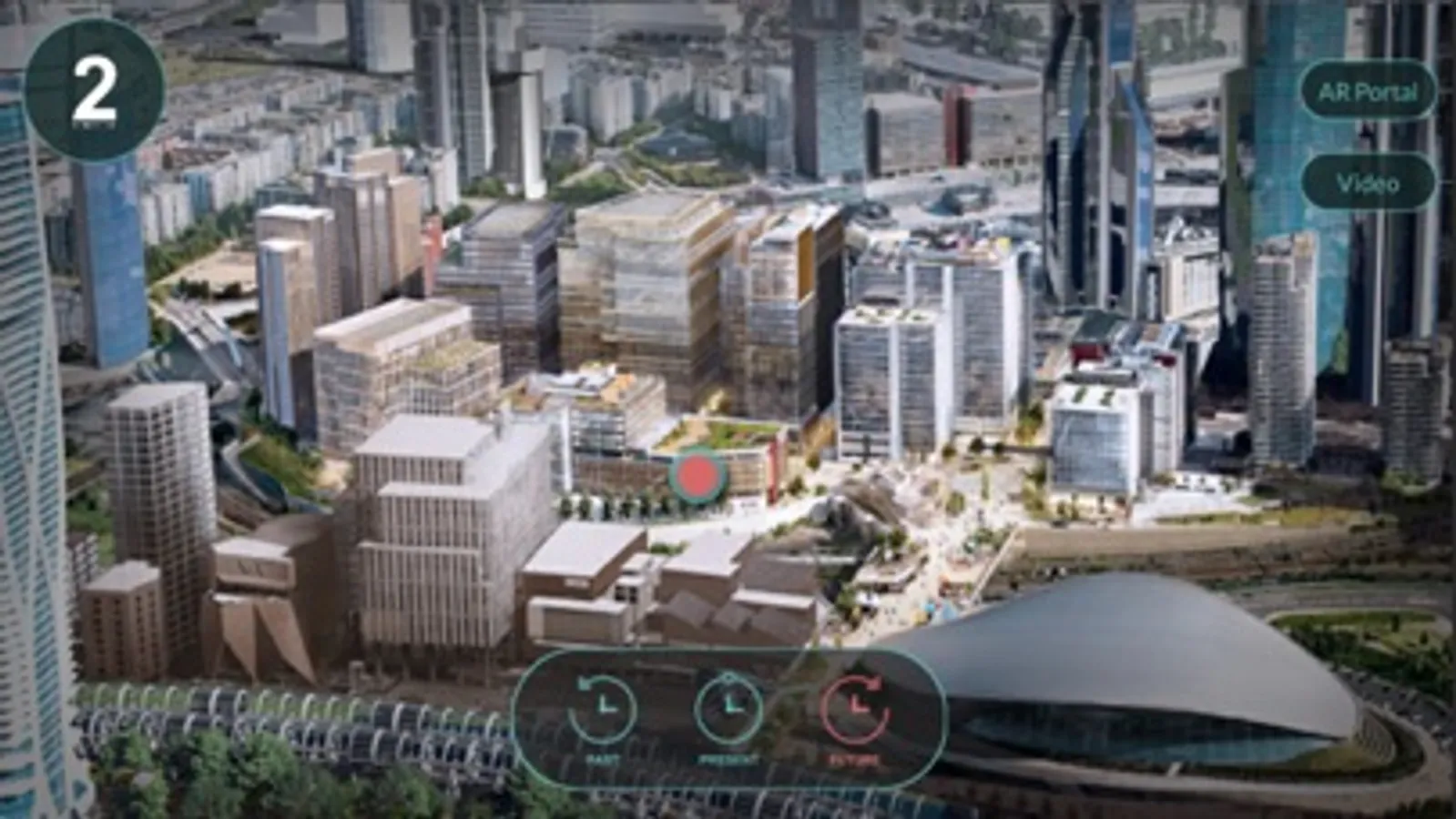 The app also features an AR portal when viewers can step-through a time gate and see an animated panorama of the International Quarter taken from the roof of 2 Redman Place.