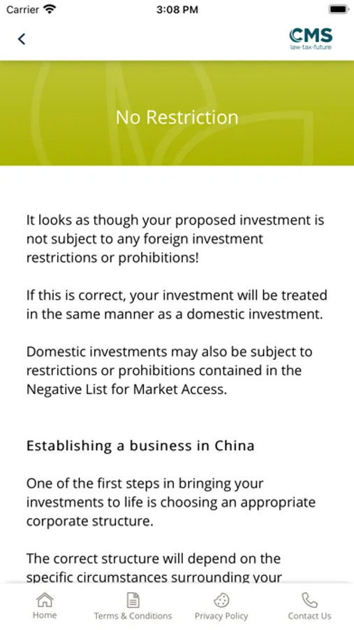 As China continues to grow year-on-year it remains as one of the most attractive destinations for international investors. In response to this, China continues to make changes which make it easier for foreign investors to do business in China, however, there are some areas which are prohibited or restricted from foreign investment. CMS has created this app which allows you to navigate China’s foreign investment laws through an easy-to-use user interface.