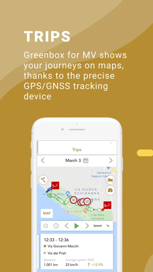 - Trips log-book: Greenbox for MV shows your journeys on maps, thanks to the precise GPS/GNSS tracking device. Consult your trip data point by point in an innovative and comprehensive way. You may also consult detailed reports related to the distance traveled, driving times, speed, etc., and even watch all this data via the virtual MV dashboard.