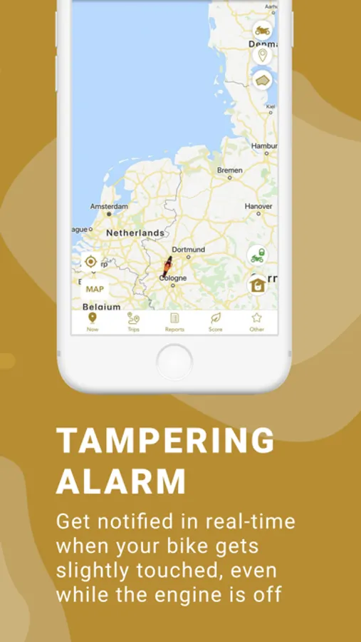 - Tampering alarm (anti-theft): get notified in real-time when your bike gets slightly touched, even while the engine is off.