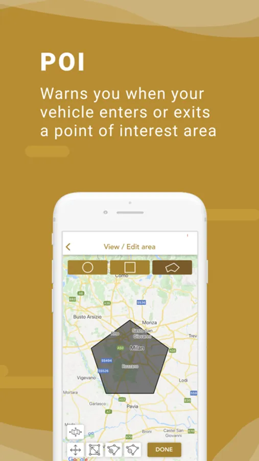 - POI (Points of Interest): you can draw geographic areas on the map and ask Greenbox for MV to send you a notification every time your bike enters and leaves the area you have defined.