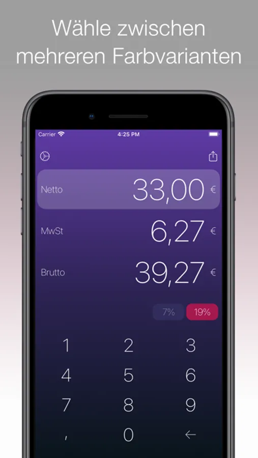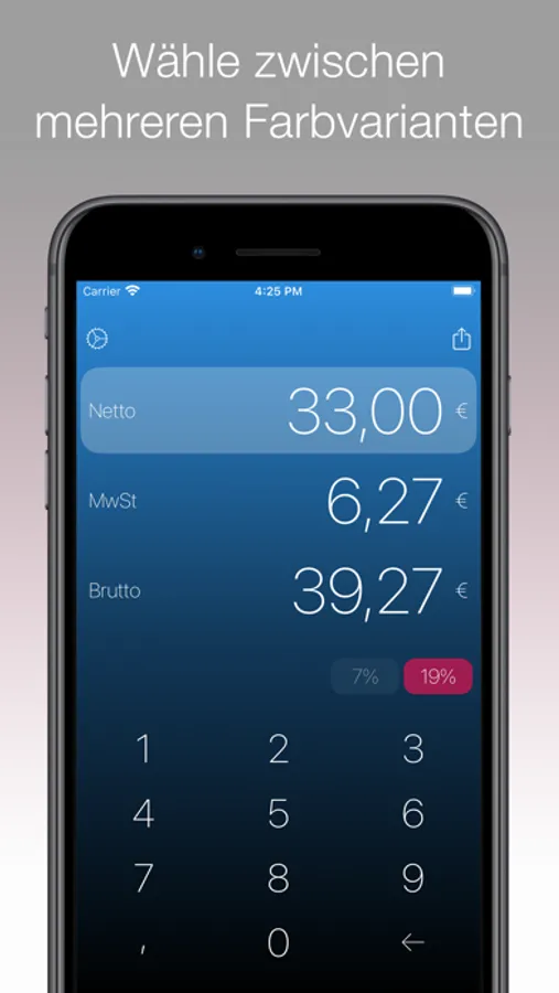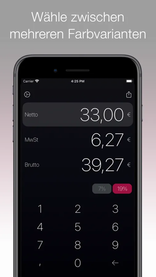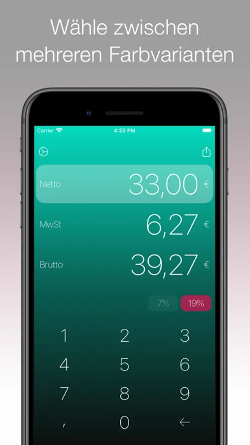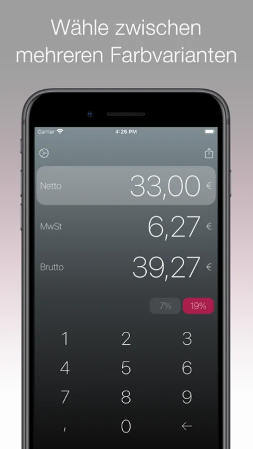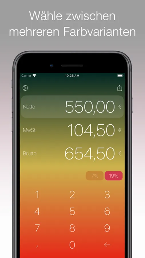 Die Mehrwertsteuersätze lassen sich - je nach Land - oder staatlicher Änderung jederzeit einstellen. Ebenso kommt der Rechner mit mehreren verschiedenen Farbvarianten daher, die sich an die individuellen Vorlieben anpassen lassen.