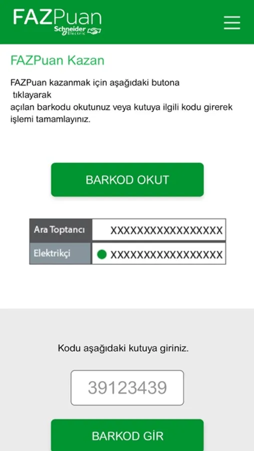 1- FAZPuan internet sitesinden iş alanınızla ilgili (distribütör / ara toptancı veya elektrikçi) kodu kazıyıp kendiniz girebilir,