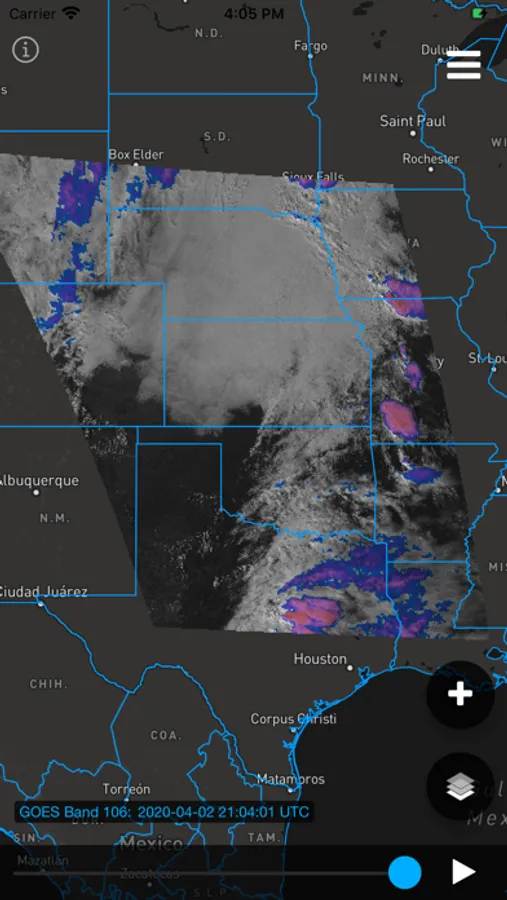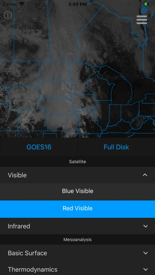 The base version of SatSquatch allows access to all available base satellite layers (full list below) as well as custom derived products such as true color or visible/infrared composite layers. The application also allows users to loop through up to 50 images and toggle overlays for their location, state borders, country borders, major highways, SPC outlook, etc.