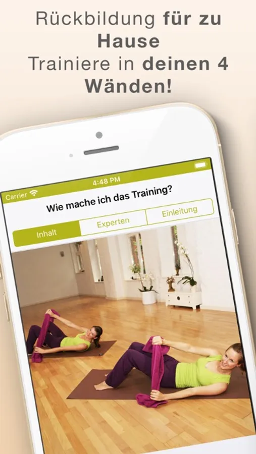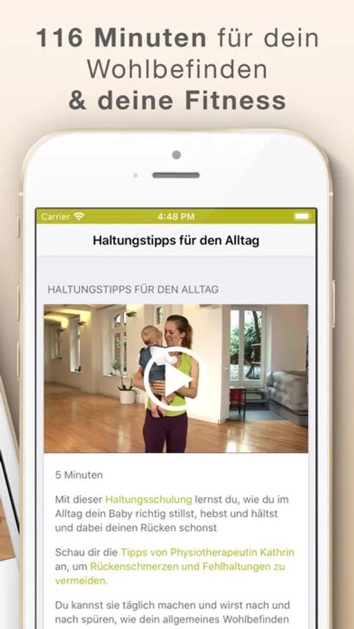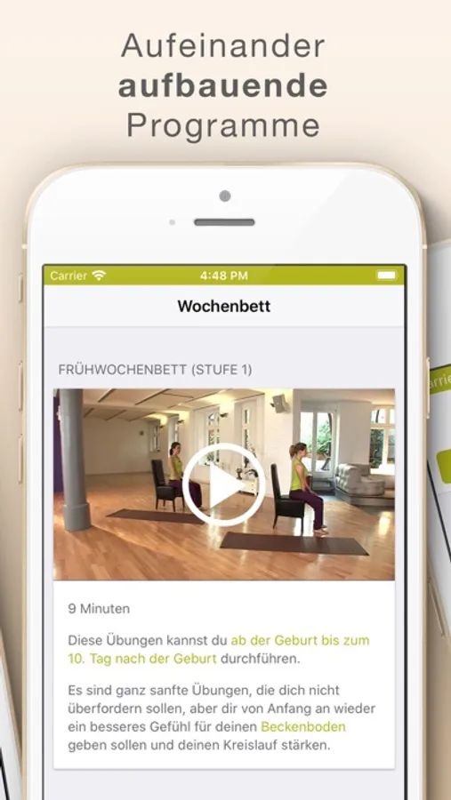 Diese App beinhaltet eine ausführliche Einleitung, damit du die Funktion deines Beckenbodens verstehst, ein Programm für das Frühwochenbett, ein Programm für das Spätwochenbett (10 Tage nach der Geburt), Rückbildungsgymnastik ab 8 Wochen nach der Geburt, Rückbildungsgymnastik für Fortgeschrittene, Kurzprogramm 8 Wochen nach der Geburt, Kurzprogramm für Fortgeschrittene sowie Haltungstipps für den Alltag, die Rückenschmerzen vorbeugen.