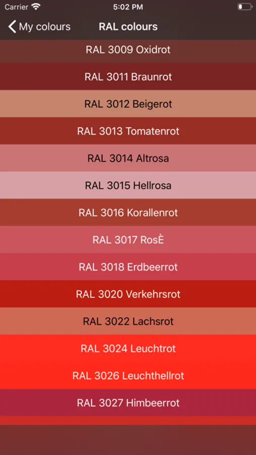 The app contains complete colour lists of colour systems RAL CLASSIC, RAL DESIGN and RAL EFFECT including a search function.