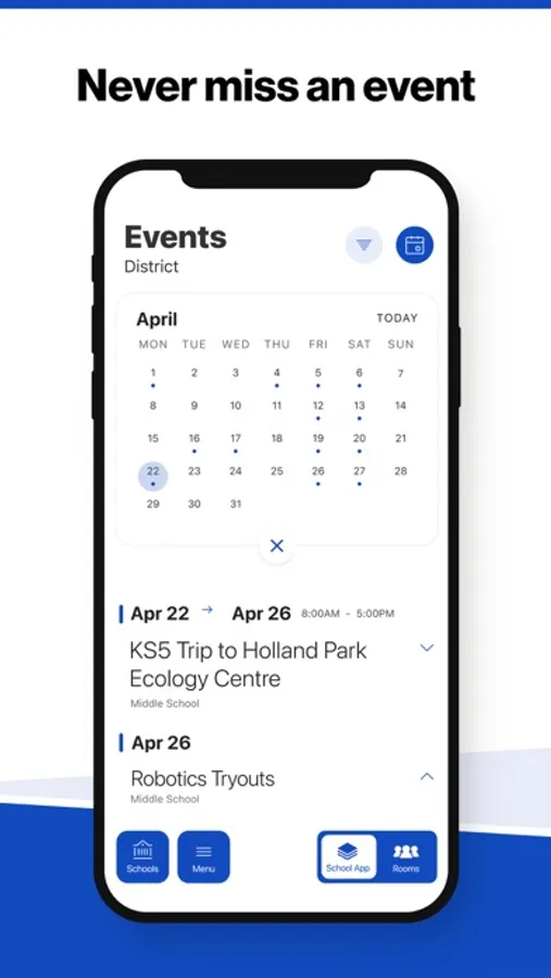 The event section shows a list of events throughout the district. Users can add an event to your calendar to share the event with friends and family with one tap.
