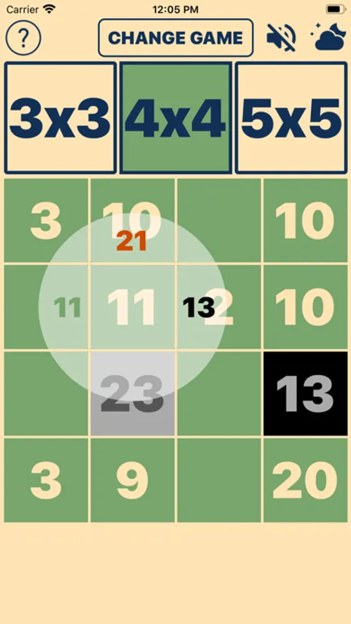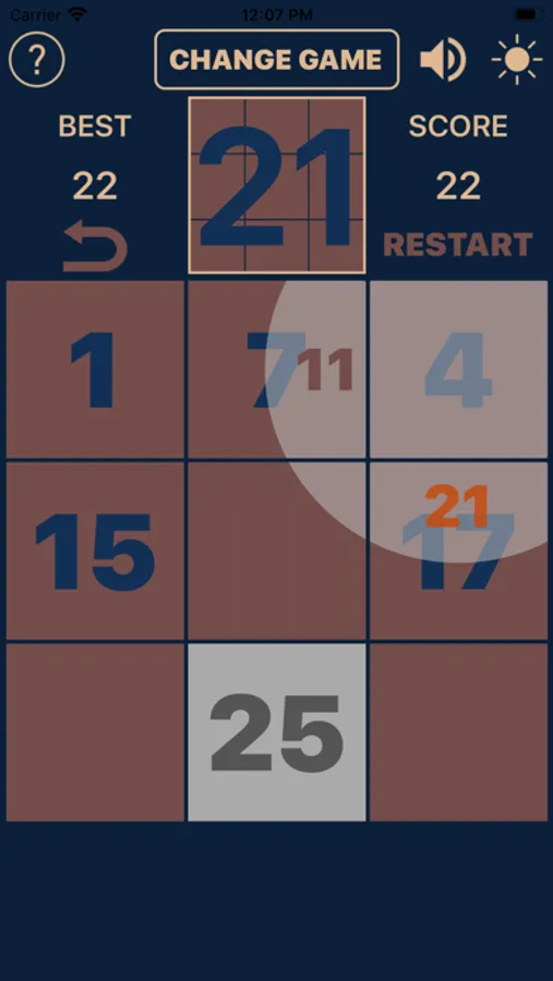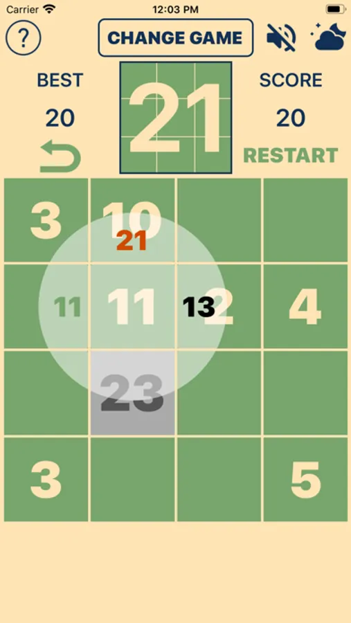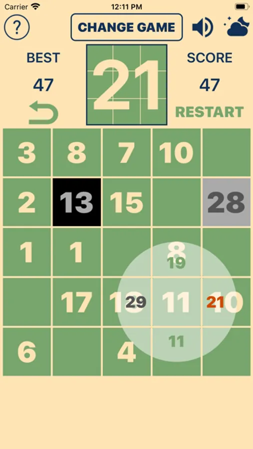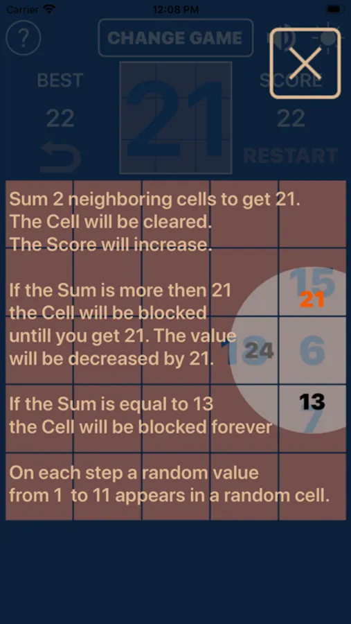 Sum 2 neighboring cells to get 21. The Cell will be cleared. The Score will increase.