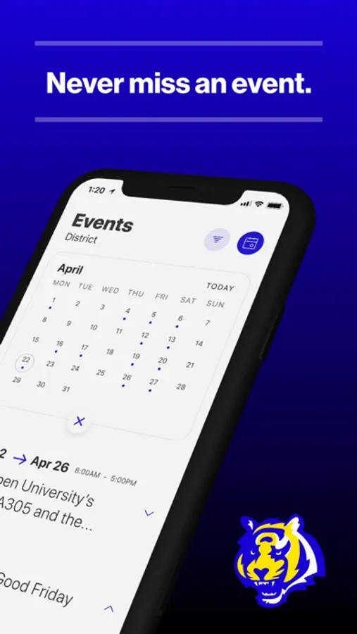 The event section shows a list of events throughout the district. Users can add an event to your calendar to share the event with friends and family with one tap.