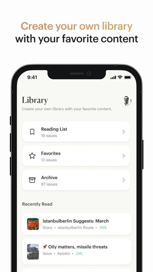 Library: Create your own reading lists in the Library to revisit your favorite issues or read them later.