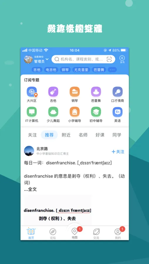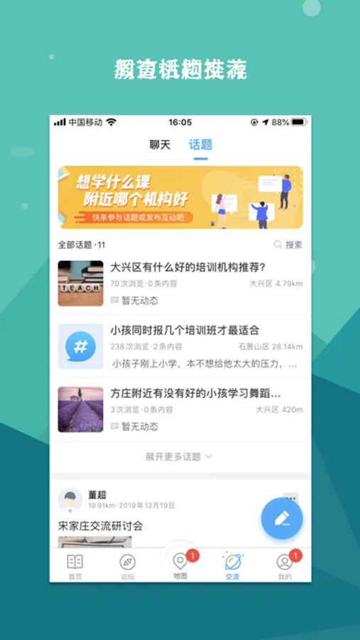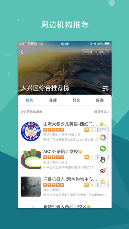 蔚来论坛,这里有您身边靠谱的教育机构推荐,学员及家长可以搜索和关注自己感兴趣的机构,随时了解和查看机构资讯与动态,您可以通过长期了解这些机构来决定是否报名从而减少消费陷阱。蔚来论坛里的机构均进行了严格的认证,也会请机构之间进行相互认证,杜绝水军刷榜。如果您是机构,在这里您可以用快捷简单的方式为自己的机构做推广宣传,编辑精美的宣传主页随时分享到社交平台上,让您机构的实力得到更好地体现。