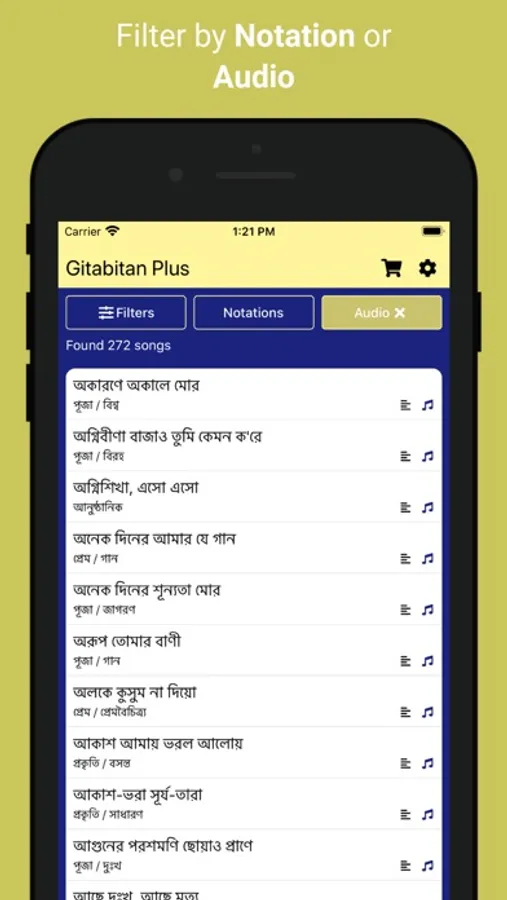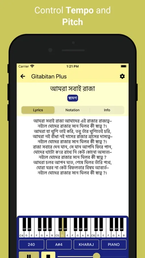 Gitabitan Plus is a complete Rabindra Sangeet app with lyrics, notations (swaralipi) and audio. The most important feature of Gitabitan Plus is the ability to playback the notations on the desired scale and tempo. The Live Piano View shows the current note being played, right on your mobile screen.