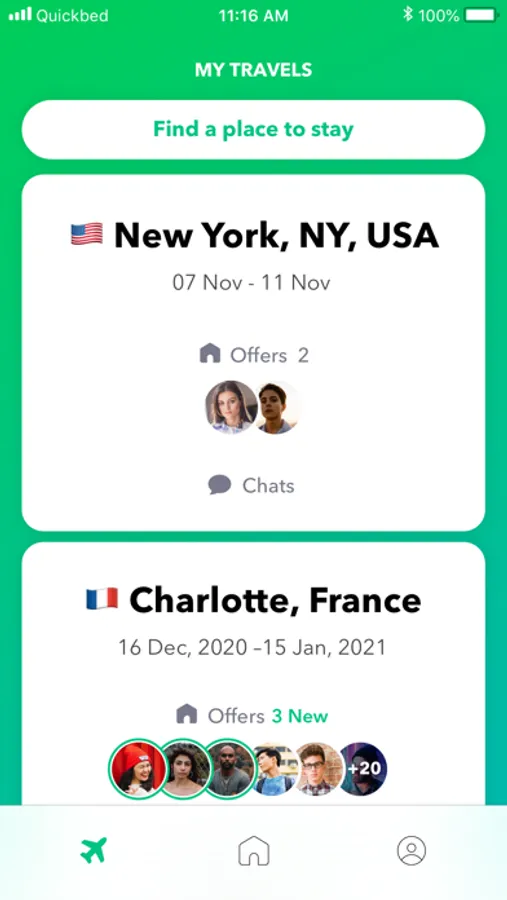 Quickbed helps you to find accommodation very quickly, without the tiring process of browsing endless options. Create a trip and get instant offers from available properties that match your preferences.