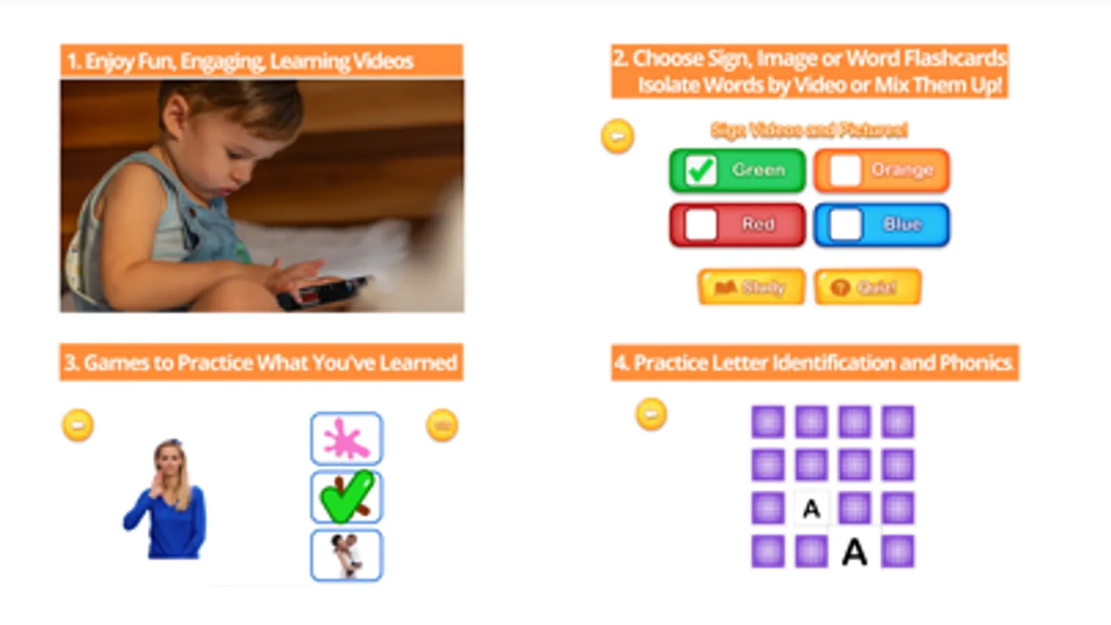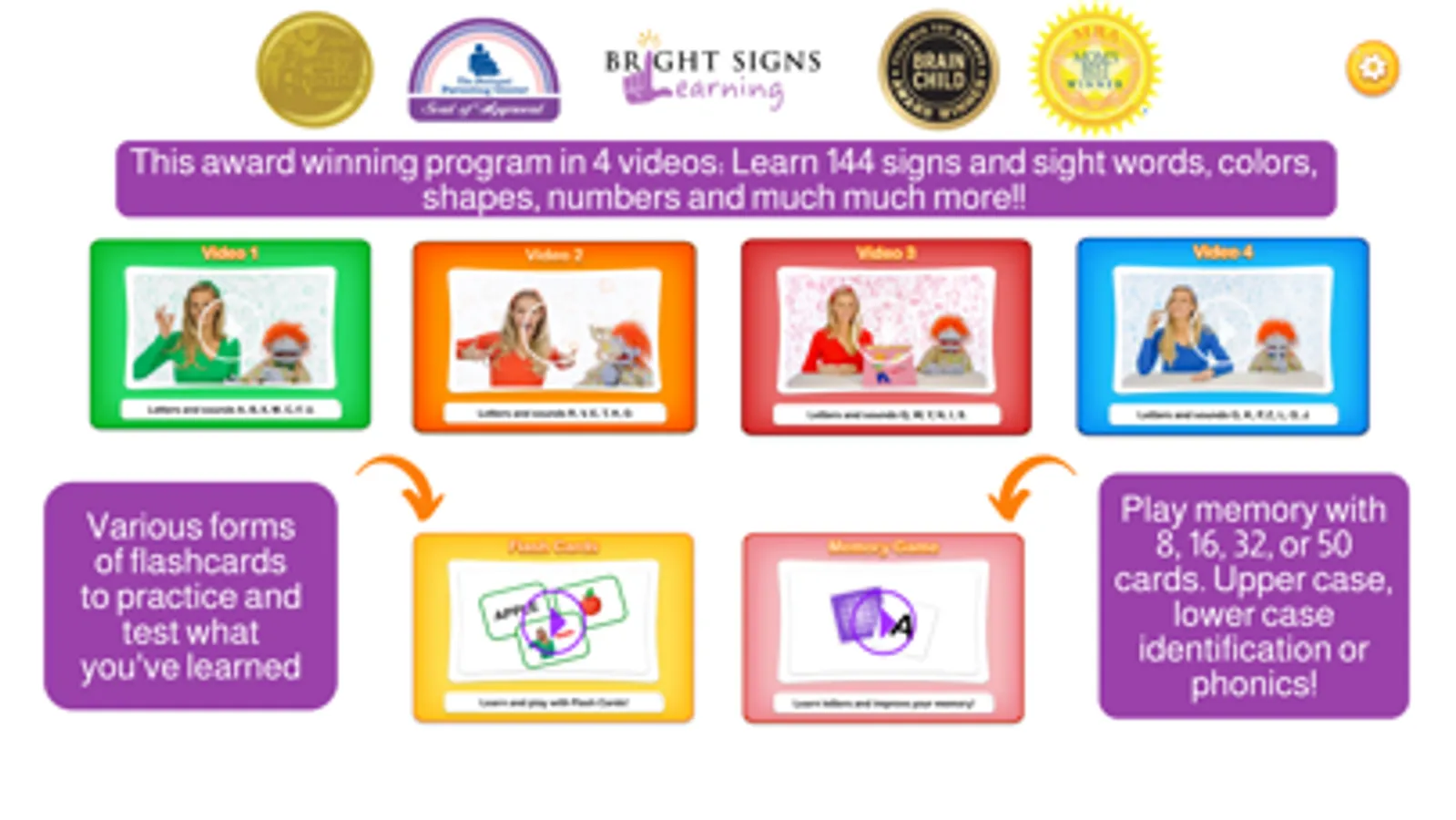 Bright Signs Learning is an award winning learning program that introduces early reading concepts through sign language and a multi-sensory experience that includes videos, interactive sign language flashcards for learning and quizzing, memory card game for letter identification and phonics, and lots of interactive fun! This fun, natural and educational learning app puts young children on the path to joyful learning.