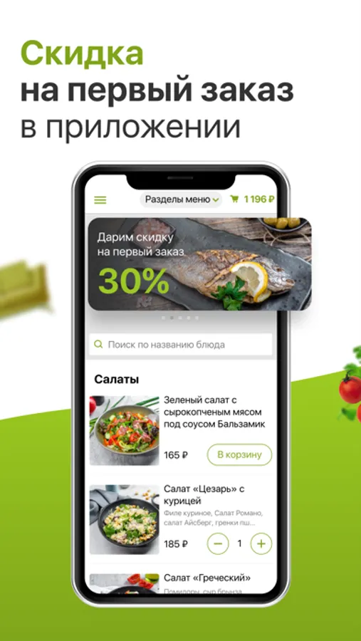 - Дарим скидку 30% на первый заказ через приложение и 20% на повторный заказ в течение двух недель!