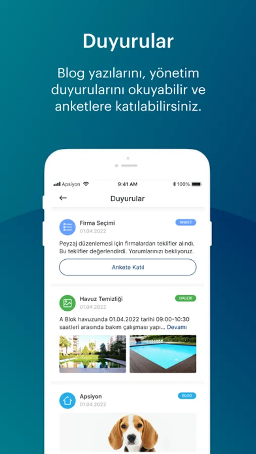 • Anket ve Fotoğraflar: Yönetiminizin sizlerle paylaştığı anketlere katılabilir, paylaşılan fotoğraflara yorum yazabilirsiniz.