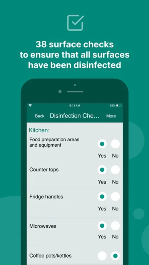 The app contains a comprehensive checklist with 38 checks to ensure that all surfaces have been disinfected.